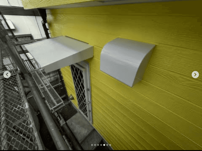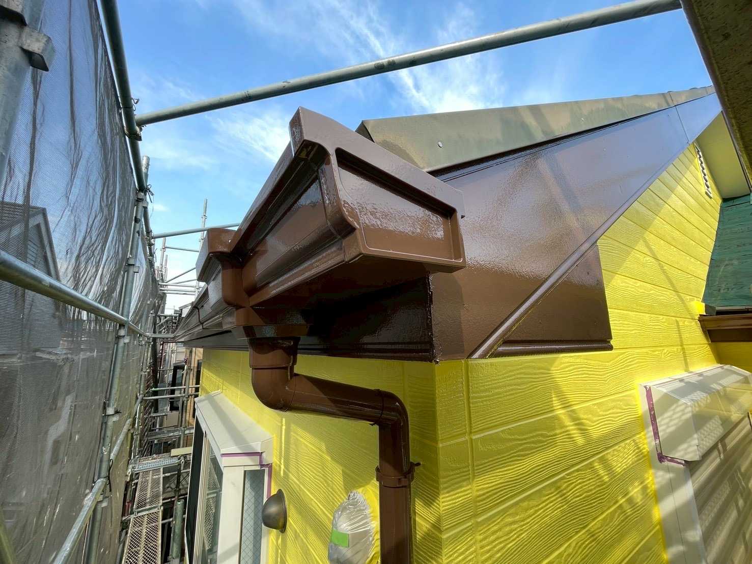 付帯部は破風と雨樋は屋根のカバー工法後の色に合わせたカーキ系で塗装し、シャッターボックスなどはサッシの色に合わせて白系で塗装しました。